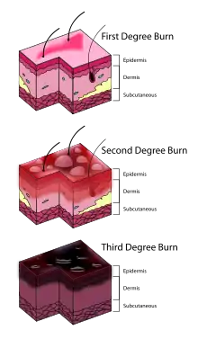 | درجه سوم | از طریق تمام درماتها گسترش می یابد [9] | سفت و سفید / قهوه ای[9] یا بدون سفیدی[5] | چرب و چرمی مانند [9] | بدون درد [9] | طولانی مدت (ماه ها) و حتی نا تمام[9] | Scarring, contractures, amputation (early excision recommended)[5] | ![]() |
