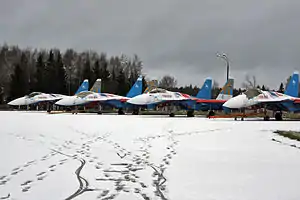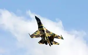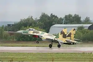 - مدل سوخو-۲۷-ام یک پروژهٔ آزمایشی برای بروزرسانی سوخو-۲۷ به یک جنگندهٔ نوین و برتر بود. حرف M در این پروژه بیانگر واژهٔ (به روسی: Modernizerovany) به معنی «نوینشده» است.[101] این نمونه با بدنهای با خمیدگی بیشتر در بخش میانی و دماغه، افزودن پیشبال، افزایش طول دمهای عمودی، توانایی سوختگیری هوایی، تبدیل ارابهٔ فرود جلو از تکچرخی به دوچرخی، بکارگیری موتور بهینهتری با نام AL-31FM ارائه شده بود.[102] درمجموع تنها ۱۴ فروند از سوخو-۲۷-ام ساخته شدهاست که شامل (۲ فروند پیشنمونه، ۹ فروند آزمایشی و ۳ فروند محصول نهایی) بودهاست و این پروژه تا پیش از سال ۱۹۹۵ به پایان رسید. این هواپیما هرگز به تولید انبوه نرسیدهاست.[103]