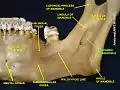 ![]() Mandible. Inner surface. Side view. (Mandibular foramen visible at left.) | |