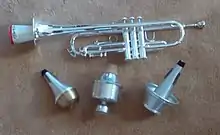 ترومپت با سوردین کاغذی; در پایین بهترتیب از چپ به راست سوردین مستقیم, سوردین هامونی و سوردین فنجانی