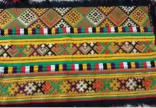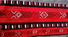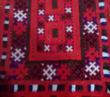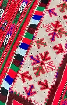 سپس فواصل بین طرح قرمز وقهوه ای تیره، با سبز پر میشود. فواصل مابین طرح قرمز و سفیدُ با ابی پر میشود فواصل مابین طرح سفید و قهوه ای با سیاه پر میشود؛ و این تکرار همچنان ادامه مییابد درسرتاسر دوخت.
