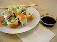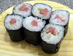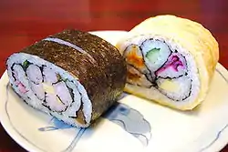 ماکیزوشی (رول سوشی) نوعی سوشی است که مواد در داخل برنج به حالت رول در میآیند و دور این رول با موادی مانند جلبک نُوری یا تخممرغ املت شده، پیچانده میشود.[28]