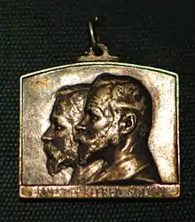 Medal cast in 1913 to commemorate the 50th anniversary of Solvay and Company. Text (in French) reads "Ernest et Alfred Solvay".