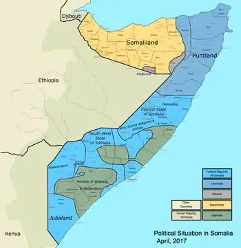 ![]() Area controlled by Somalia shown in dark green; claimed but uncontrolled سومالیلند (a self-declared اما فهرست کشورهای با رسمیت محدود) shown in light green. n.b. , zones of control are approximate at this time. | |
