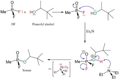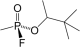 دیگر نامها GD; Phosphonofluoridic acid methyl- 1 2 2-trimethylpropyl ester; 2-(Fluoromethylphosphoryl)oxy-33-dimethylbutane; Pinacolyl methylphosphonofluoridate; 122-Trimethylpropyl methylphosphonofluoridate; Methylpinacolyloxyfluorophosphine oxide; Pinacolyloxymethylphosphonyl fluoride; Pinacolyl methanefluorophosphonate; Methylfluoropinacolylphosphonate; Fluoromethylpinacolyloxyphosphine oxide; Methylpinacolyloxyphosphonyl fluoride; Pinacolyl methylfluorophosphonate; 122-Trimethylpropoxyfluoromethylphosphine oxide | |