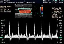 سونوگرافی داپلر (به انگلیسی: Doppler sonography) نوعی از سونوگرافی است که برای تصویربرداری خون جاری در قلب و عروق استفاده میشود. در مامایی نیز از سونوگرافی داپلر جهت گوش دادن به صدای قلب جنین استفاده میشود. سونوگرافی داپلر همچنین برای تشخیص ترومبوز وریدی، واریکوسل، تنگی و انسداد شریانی به ویژه در شریان کاروتید استفاده میشود.[2][3][4]