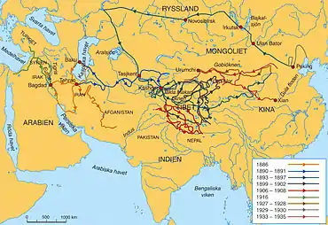 - مشارکتکنندگان ویکیپدیا. «Sven Hedin». در دانشنامهٔ ویکیپدیای انگلیسی، بازبینیشده در ۱۲ مه ۲۰۱۴.