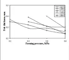شکل 11 ضخامت قطب نیم کره های کاملاً شکل یافته را به عنوان تابعی از ایجاد فشار در دماهای مختلف نشان می دهد. در دمای خاص ضخامت قطب با افزایش فشار شکل گیری کاهش می یابد. برای کلیه موارد مورد بررسی ، ضخامت قطب در دامنه حدود 0.3 تا 0.4 میلی متر از ضخامت خالی اصلی 1 میلی متر قرار داشت.