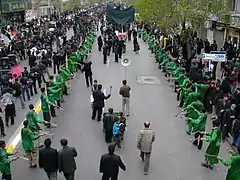 رسم است که تابوتها و علمهای سبز (علامتهای ارتش حسین، تزئین شده با نقره، طلا و برنج) در صفوف منظم توسط مردان پابرهنه که سینه میزنند، مرثیه میخوانند و گاهی اوقات برای ابراز غم و اندوه خود، خودزنی میکنند، حمل میشوند. این پروسه در طول ماه محرم ادامه دارد و در روز دهم ماه، که روز عاشورا نام دارد، به اوج خود میرسد.