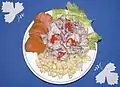 سویچه با ماهی قزل آلا، پیاز بنفش، میگو، گشنیز، لیمو و ادویه جات ترشی جات.