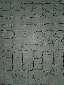 نوار قلب (ECG) مجموعه ای از لیدها است که بر روی قفسه سینه فرد قرار میگیرد و فعالیت الکتریکی مرتبط با انقباض عضله قلب را اندازهگیری میکند.[16] گرفتن نوار قلب بخش مهمی در روند تشخیص AMI است،[24] و نوار قلب اغلب فقط یک بار گرفته نمیشود بلکه ممکن است در عرض چند دقیقه تا چند ساعت تکرار شود، یا در پاسخ به تغییر علائم یا نشانهها گرفته شود.[24]