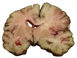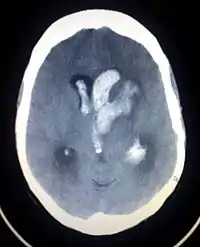 | سیتی اسکن قسمتی از مغز که ایسکمیک ناشی از سکته مغزی را نشان میدهد. | |