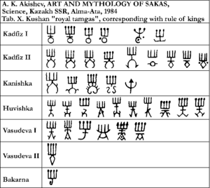 شاهان کوشانی بر روی سکهها خودشان را به رسم هخامنشیان شاهنشاه نامیدهاند. بر روی سکههای پیش از کانیشکا، این عنوان با زبان یونانی و به صورت ΒΑΣΙΛΕΥΣ ΒΑΣΙΛΕΩΝ ضرب شدهاست، حال آنکه از دوران او و پس از او سکهها به زبان بلخی ضبط شدهاند. شکل بلخی واژه شاهنشاه ϷAONANOϷAO است.[2]
