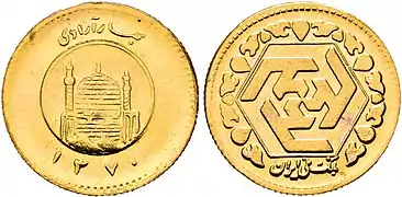 - مهریه ازدواج — در بسیاری از اوقات، مهریهٔ دختران ایرانی بر مبنای سکههای طلا تعیین میشود؛ از سال تولد دختر گرفته تا شمار ائمه یا سورههای قرآن کریم به عنوان تعداد سکههای مهریه دختران بریده میشود.[36] پژوهشهای انجامشده نشان میدهند که میانگین مهریه زنان ایرانی، بین ۲۶۰ تا ۳۵۰ سکه طلا است.[45][46][47] البته مهریههایی با مبنای ۱۲۴۰۰۰ سکه طلا هم دیده شدهاست.[48]