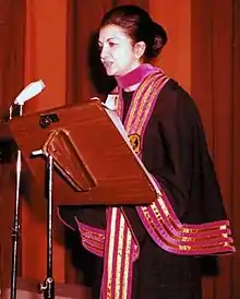 ![]() دکتر سیمین جلالی در حال سخنرانی در جشن فارغالتحصیلی مدرسه عالی شمیران، ۱۳۵۵ | |