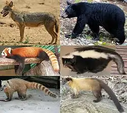 | All extant land-dwelling caniform families (clockwise from top left): سگسانان, خرس, راسوی آمریکایی, راسویان, خرسکیان, سرخپاندایان | |
