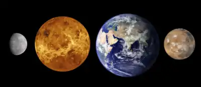 - سنگی: سیاراتی که شبیه به زمین هستند و بدنهٔ آنها عمدتاً از سنگ تشکیل شدهاست: تیر، ناهید، زمین و بهرام. تیر با ۰٫۰۵۵ جرم زمین کوچکترین سیاره سنگی و زمین بزرگترین سیاره سنگی منظومه شمسی هستند.