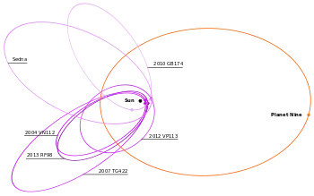 ![]() این ارتباط مداری در میان شش جرم دور دست فرانپتونی منجر به پیدایش شواهد غیر مستقیم و تقویت فرضیه وجود سیارهٔ ۹ شدهاست. | |