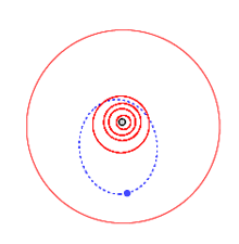 ![]() Orbit of 1036 Ganymed (blue), planets (red) and the خورشید (black). The outermost planet visible is مشتری (سیاره). | |