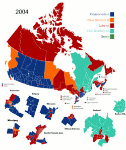 حزب لیبرال کانادا با رهبری پل مارتین[6] در انتخابات عمومی ژوئن ۲۰۰۴ با اقلیت برنده شد. در دسامبر ۲۰۰۳ مارتین جانشین همکار لیبرال خود، ژان کرتین شد که در سال ۲۰۰۰ به اولین نخست وزیری تبدیل شده بود که از سال ۱۹۴۵ توانسته بود پشت سر هم سه دولت اکثریت را رهبری کند. اما در سال ۲۰۰۴، لیبرالها صندلیهای خود را در پارلمان از دست دادند و به جای ۱۷۲ صندلی از ۳۰۱ صندلی، تنها ۱۳۵ صندلی از ۳۰۸ صندلی را به دست آوردند که یعنی به جای ۴۰٫۹ درصد، ۳۶٫۷ درصد از رأی مردم را کسب کردند. حزب اتحاد کانادا که در انتخابات ۲۰۰۰ در غرب کانادا به خوبی عمل کرده بود، نتوانست در شرق کانادا نتیجه قابل توجهی به دست آورد و در نتیجه در اواخر سال ۲۰۰۳ با حزب محافظه کار پیشرو برای تشکیل حزب محافظه کار کانادا ادغام شد.