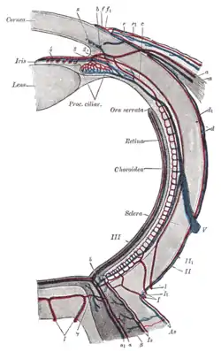 | Diagram of the blood vessels of the eye, as seen in a horizontal section. ("V", at center right, is the label for the vena vorticosa) | |