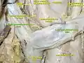 | غده تیروئید و ارتباطات آن. (برجسب سیاهرگ بینام چپ و راست در مرکز و پایین قابل مشاهده است.) | |