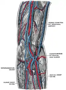 سیاهرگهای عمقی اندام فوقانی. (ورید رادیال در پایین راست برچسب خورده است.)