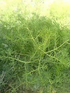 این گیاه پایا، ایستاده با بوتههای انبوه درهم، با شاخههای بسیار منشعب بلند، سبز مایل به آبی یا کم و بیش متمایل به خاکستری است.[3] این گیاه بوتهای یکساله است که بهطور معمول تا ۳۰ سانتیمتر رشد میکند اما در بعضی شرایط محیطی گاه تا یکی دو متر هم قد میکشد. هنگام خشک شدن ساقه-چوب سبک، باریک و سستی دارد و پس از یک یا چند سال پوسیده و خاک میشود.