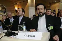 سید عباس عراقچی (زاده ۱۳۴۱ تهران[5]) دیپلمات و سیاستمدار ایرانی است که از بهمن ۱۳۹۶ به عنوان معاون سیاسی وزارت امور خارجه فعالیت میکند. او از اعضای تیم مذاکرهکننده هستهای ایران با گروه ۱+۵ به همراه یکی از مشاورین ارشد خود بنام صالحی در وین حضور داشته است.