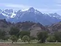 چالگاه نهر میلز رشته کوه نوادا (در مرکز) که سمت غرب قله سیرا، و جنوب دریاچه مونو (قسمت آبی رنگ بالا) قرار دارد.
