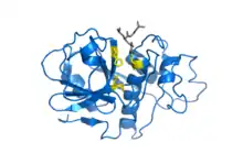 ![]() ساختمان کریستالی سیستئین پپتیداز پاپئین در ترکیب با مهارکنندهٔ کووالانسیاش E-64 | |||||||||