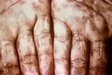 |coauthors=ignored (|author=suggested) (help) - Mullooly, C; Higgins, SP (August 2010). "Secondary syphilis: the classical triad of skin rash, mucosal ulceration and lymphadenopathy". International journal of STD & AIDS. 21 (8): 537–45. doi:10.1258/ijsa.2010.010243. PMID 20975084.