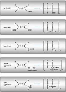 جزء مهم دیگر سیمان گلاس آیونومر اسید است. یک اسید پلیمری که دارای گروه کربوکسیلات است. اسید پلیمریک اصلی که در ابتدا در سیمان گلاس آیونومر استفاده شده، پلی (اسید اکریلیک) بودهاست. پلی (اسید اکریلیک) عضوی از دستهای از مواد با عنوان پلی الکترولیتهاست، که دارای ترکیبی از ویژگیهای پلیمر و الکترولیت هستند.[6] ویژگی دوم از حضور زنجیره ممتد پلیمر با تعداد قابل توجهی گروههای عملکردی که قادر به حمل بار الکتریکی هستند، ناشی میشود. در مورد بسیاری از پلی الکترولیتهایی که برای ساخت سیمانهای گلاس آیونومر استفاده میشود، این گروههای عملکردی کربوکسیلیک اسیدها CO2H -، هستند. همچنین پلی الکترولیتها به دلیل وجود گروههای عملکردی قطبی قادر به حمل بار، محلول در آب هستند.[6]