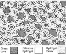 - تجزیه پودر شیشه: سطوح ذرات شیشه توسط اسید مورد حمله قرار میگیرد و ۲۰ تا ۳۰ درصد سطح تخریب میشود و کاتیونهای فلزی در محلول آزاد میشوند در نتیجه یک لایه ژل سیلیکا در اثر پلیمر یزاسیون روی سطح ذرات شکل میگیرد و شیشه واکنش نکرده به عنوان هسته برای این ژل سیلیکایی عمل میکند.