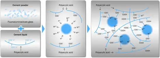 - ژل شدن: با افزایش غلظت کاتیونها، مقدار pH فاز آبی افزایش یافته، که منجر به افزایش یونیزاسیون کربوکسیلیک اسید میشود. در یک نقطه خاص از pH و غلظت یونی، ساختار ژل از طریق اتصالات عرضی یونی ضعیف حاصل از تشکیل پیوندهای هیدروژنی تشکیل میشود. فرایند ژل شدن شیشههای گلاس آیونومر به شرح زیر توصیف شدهاست: در نتیجهٔ افزایش یونیزاسیون، گروههای کربوکسیلات زنجیرههای پلیمری باردار میشوند، یکدیگر را دفع میکنند، احتمالاً یک پیکربندی خطیتری به خود میگیرند. پیشرفت واکنش کاتیونهای فلزی با گروههای کربوکسیلات باعث افزایش ویسکوزیته سیمان میشود. به نظر میرسد نفوذ این کاتیونها اثر اصلی را بر واکنش ژل شدن سیمان دارد.