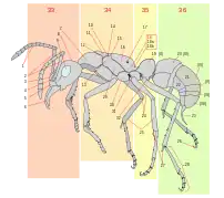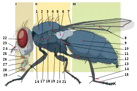 به هر یک از این بخشهای یادشده یک جفت پا و در حشرات بالدار به میانسینه و پسسینه، هر کدام یک جفت بال متصل است. و در حشرات امروزی پیشسینه فاقد بال است، هر چند که نمونههای فسیلی حاکی از وجود یک جفت بال نیز در حشرات قدیمی است. پاها نیز دارای ساختمان مفصلی و بند بند هستند. همچنین سینهگاه از بند دوم و گاهی از بند اول در هر بند دارای یک زوج سوراخ تنفسی میباشند که تا بندهای انتهایی شکم (هشتم) به همین شکل ادامه پیدا میکنند.