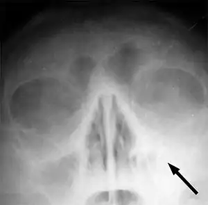 | سینوزیت در کاوک چپ فک بالایی. به علت کمبود هوا در حفره چپ و وجود ترشحات، این ناحیه سفید دیده میشود. | |