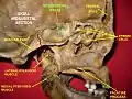 ![]() دیواره جانبی حفره بینی: سه کونکای بینی برداشته شدهاند; (Sphenoidal sinus visible at upper right, in dark circle.) | |