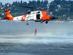 | A HH-60J Jayhawk hovering as a USCG rescue swimmer enters the water during a demonstration. | |