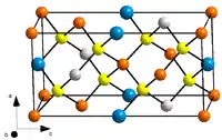 ![]() CZTS crystal structure. Orange: Cu, blue: Sn, grey: Zn/Fe, yellow: S. | |