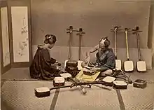 یک گیشا در توکیو با شامیسن، حدوداً. دهه ۱۸۷۰