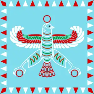 عقاب زرین نشان پرچم ایران باستان بودهاست، نقش شاهین بر درفش هخامنشی نشانهای از پیروزی و نمادی از اهورامزدا در پرندگان میباشد. (نام این پرنده شهباز است که بسیار کمیاب و زیبا بوده)[4]