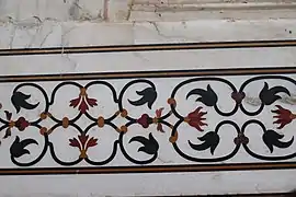 در داخل آرامگاه یا درگاه تاج محل دو قبر وجود دارد که با سنگ مرمر یکپارچه تزئین شدهاست کنار سنگ مرمر قبر سمت راست به خط نستعلیق فارسی نوشته شدهاست: