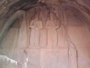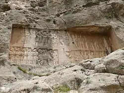 - در ایوان (یا مغاره) کوچک طاق بستان در ۵ کیلومتری شمال شرقی شهر کرمانشاه دو نقش برجسته یکی از شاپور دوم در سمت راست و دیگری از شاپور سوم در سمت چپ آن وجود دارد. در کنار هر یک از آن دو، کتیبهای به زبان پهلوی، شکل اسم و نسب هر یک کنده شدهاست. کتیبه شاپور دوم دارای ۹ سطر و کتیبه شاپور سوم دارای ۱۳ سطر است.[58]