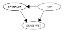 دو رویداد میتواند باعث مرطوب شدن چمن شود: یک آبپاش فعال یا باران. باران تأثیر مستقیمی در استفاده از آب پاش دارد (یعنی وقتی باران میبارد، آبپاش معمولاً فعال نیست). این وضعیت را میتوان با یک شبکه بیزی مدلسازی کرد (در سمت راست نشان داده شده). هر متغیر دارای دو مقدار ممکن است T (برای true) و F (برای false).