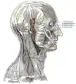 ![]() Dermatome distribution of the trigeminal nerve (Superficial cervical plexus visible in purple, at center bottom.) | |