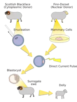 دالی گوسفند ماده فین دورست، اولین پستانداری است که با موفقیت از سلولهای بالغ یک گوسفند بزرگسال کلون شدهاست. دالی به وسیله دادن یک سلول از پستان مادر زیستی قدیمی ۶ ساله اش شکل گرفت.[12] محتویات سلول پستان مادری به تخمک گوسفند انتقال[13] و سپس جنین حاصل در داخل بدن گوسفند ماده قرار گرفت تا روند طبیعی حاملگی را در پیش بگیرد. دالی در مؤسسه روزالین در اسکاتلند در سال ۱۹۹۶ ایجاد و ۶ سال عمر کرد.[14]