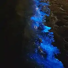 شب تاب دریایی؛ نور آبی رنگی در حاشیه ساحل شهر چابهار چابهار که در فصلهای پاییز و زمستان دیده میشود.[2]