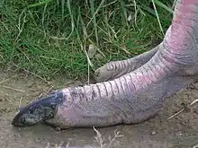 - پوست نرم، لطیف و با مقاومت بالا است که جای پرها (فولیکول) روی پوست دیده میشود. چرم پای شتر مرغ دارای طرحی منحصربفرد است و در تولید انواع کیف و کفش از آن استفاده میشود. پوست شترمرغ در بازارهای جهانی تا ۴۰۰ دلار قیمت دارد.
