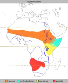 | پراکنش کنونی زیرگونههای شترمرغ | |